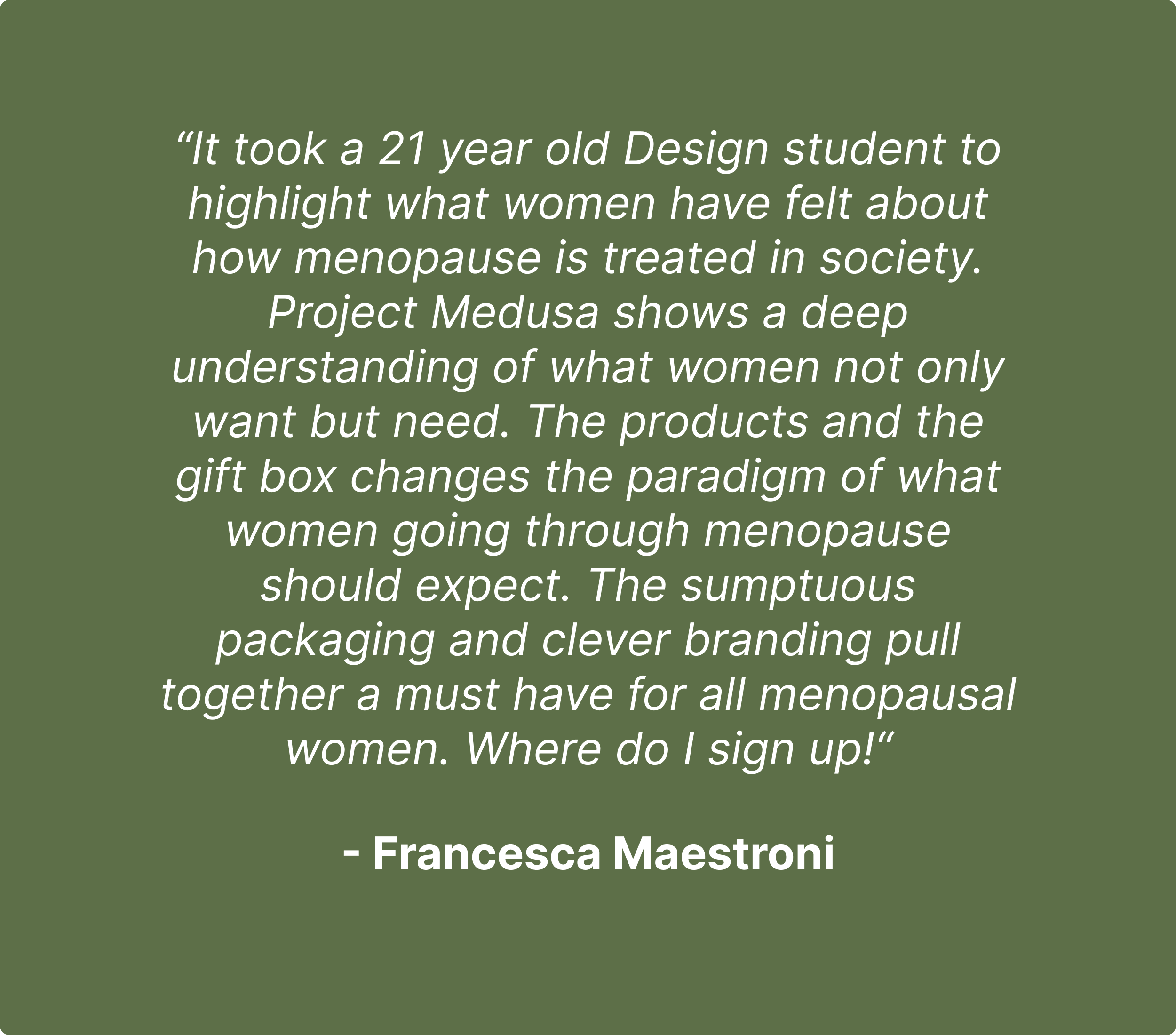 This project was inspired by watching my mother, silently coping with the effects of menopause. I felt the current products were underwhelmingly branded and contributed to a general feeling that menopause was perceived as an unspoken illness.